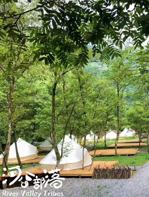 犀牛寨河谷部落露營基地周圍綠意盎然,空氣清新,景色宜人,營地坐落在峽谷茂林之中,有清河碧波順流而過,為游客提供了一個清幽、寧靜的露營環境。