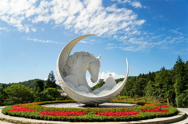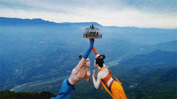 作為全球唯一以愛(ài)情為主題的“飛天之吻”,成為白馬山必游景點(diǎn)之一。它由兩臺(tái)大型的飛行島組成,南邊的飛島代表白馬王子,北邊的飛島代表仙女。當(dāng)你坐進(jìn)觀光艙,飛行島緩緩旋轉(zhuǎn)上升,升至52米高空時(shí),兩臺(tái)飛行島會(huì)聯(lián)動(dòng)運(yùn)行,最終在高空定格“接吻” 。此時(shí),腳下是1314米的烏江垂直落差,眼前是遼闊的自然風(fēng)光,刺激與浪漫并存,絕對(duì)是不容錯(cuò)過(guò)的打卡體驗(yàn)。