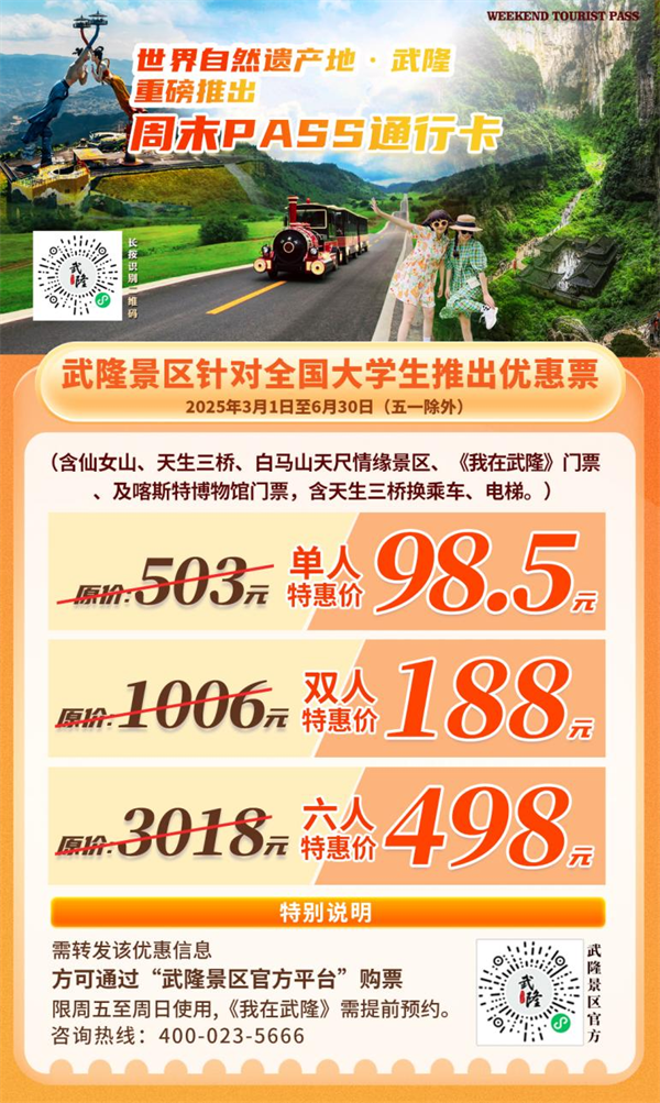 武隆景區(qū)針對(duì)全國(guó)大學(xué)生推出了周末PASS通行卡,2025年3月1日至6月30日,單人、雙人及六人套餐,折扣低至1.7折,周五、周六、周日均可使用(五一假期除外)。