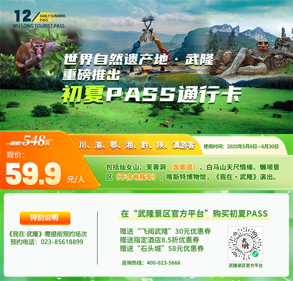 5月6日—6月30日,川渝鄂湘黔陜滇的寶子們有福啦!59.9 元就能拿下價值548元的超值套票!仙女山的治愈草場、芙蓉洞的奇幻鐘乳石、白馬山天尺情緣的浪漫打卡地、懶壩的藝術奇遇,還有《我在?武隆》演出、喀斯特博物館,一票全含!更有“飛閱武隆”30元優惠券、指定酒店8.5折、“石頭城”58元券等隱藏福利,這波羊毛不薅真的虧!