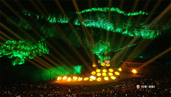 晚間觀看《印象武隆》演出,在川江號子的激昂旋律中感受巴渝文化底蘊 ;觀看《我在·武隆》演出,從云端漫步到山間徜徉,深入了解武隆喀斯特地貌奧秘。