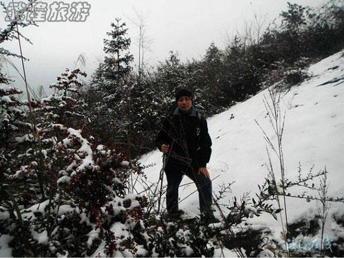 這個(gè)徒步群就像一個(gè)大家庭,開(kāi)心快樂(lè),這也是我只要有時(shí)間就會(huì)參加群里活動(dòng)的原動(dòng)力。歡聲笑語(yǔ)中,一次次前隊(duì)變后隊(duì),我們爬上了大山。雪線之上,寒風(fēng)依舊,天空洋洋灑灑飄起了雪花,殘雪上又覆蓋上了又一層晶瑩的雪花。朋友們開(kāi)心的玩著雪,拍著照片,說(shuō)著一個(gè)個(gè)活色生香的笑話,木有了旅途的疲勞,不知不覺(jué)中我們翻過(guò)了一座又一座大山,穿叢林,越小溪。站在冰雪覆蓋宛如北國(guó)風(fēng)光銀裝素裹的武隆羊角山埡口,風(fēng)雪中回望走過(guò)的一座座雪凝云靄的山巒,感嘆我們竟跨過(guò)了那么險(xiǎn)峻的山,走過(guò)了那么漫長(zhǎng)的路,佩服自己!