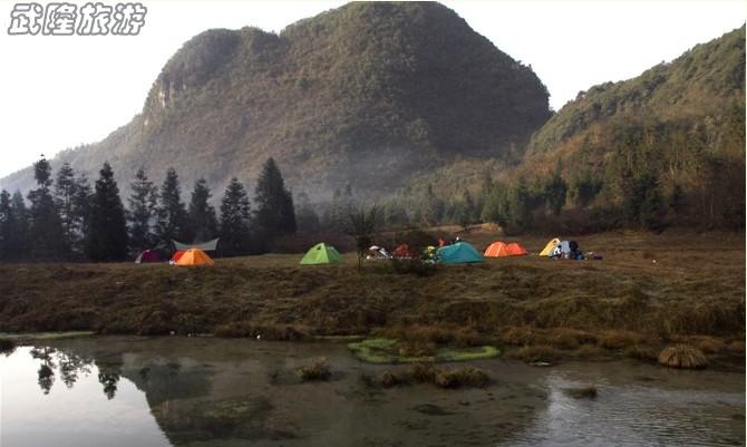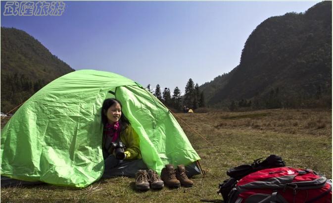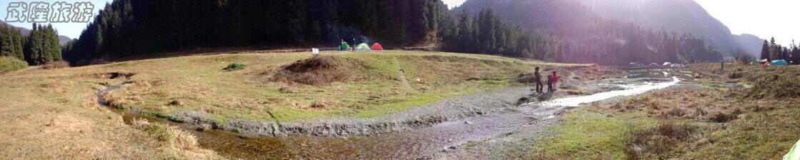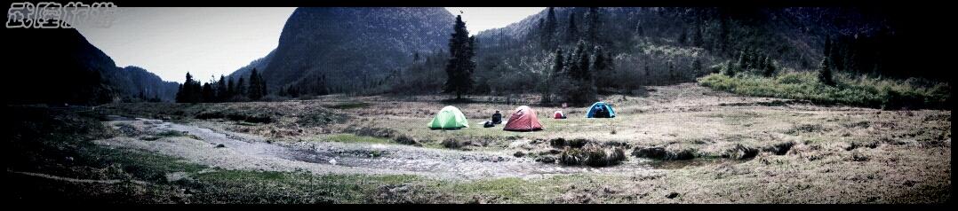 從遠(yuǎn)處看我們的露營地,山谷間三頂鮮艷的帳蓬,潺潺的溪水在帳蓬前面匯成了一汪彩色的水潭,水草漫出水面,很有些夢幻的感覺。
