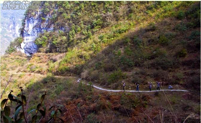 問了路,便向“核桃鄉(xiāng)”駛?cè)ィs十多分鐘后到達(dá)“核桃鄉(xiāng)”(鄉(xiāng)鎮(zhèn)修路主道被封,車子要繞道右行到看“武隆印象”的公路約百余米后再繞小路回到鄉(xiāng)鎮(zhèn)路上來),繼續(xù)向前,此時(shí)水泥路已變成了土路,一路顛簸。不一會兒就到了標(biāo)識著夢幻谷的路口了。