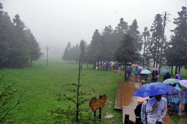 10月3號我們驅車到仙女山。一路上雨下個不停,視線很差,可是來旅游的車絡繹不絕。到了山下,看見許多小販兜售雨衣。我們一行人只有一兩人買了雨衣,大概其他人也和我的心情一樣,更想與雨中的仙女山來個親密的接觸。