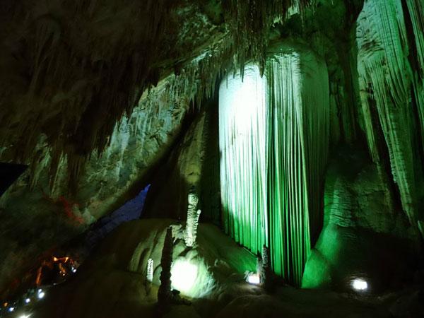 第二天早上我們早早的就起來了,前往芙蓉洞游玩。芙蓉洞是我們這次去仙女山旅游景點之一,它位于重慶武隆縣江口鎮芙蓉江入口處.芙蓉江是烏江的一大支流,放眼望去,江水碧綠,山青翠.它仿佛是一條淺綠色的綢緞環繞在洞的周圍,更透出了大自然靈秀之美! 芙蓉洞是一個大型石灰巖洞穴,生成年代約在60萬年至100萬年之間,初探結果,芙蓉洞主洞長2700米,總面積3.7萬平方米,其中“輝煌大廳”面積1.1萬平方米,最為壯觀。洞中主要景點有金鑾寶殿、雷峰寶塔、玉柱擎天、玉林瓊花、海底龍宮、巨幕飛瀑、石田珍珠、生殖神柱等。芙蓉洞內鐘乳林立,種類繁多。所到之處光影變幻,更突出了洞內景致的神奇。這些千姿百態的鐘乳石,或輝煌壯觀,或玲瓏剔透,其造型之豐富,可算芙蓉洞的第二奇。洞內最讓人唏噓的是隨處可見的石柱群,這些高25米至30米的玉筍玉柱,潔白如玉,經或紅或黃或綠的燈一射,單看如九天玉柱,群觀如仙山瓊閣,穿行其間,分明就成了桃谷仙人。洞中有一石瀑布,側看如瀑,正看如幕,高20余米,寬15米,折疊深度在1.5米以上,令人嘆為觀止。芙蓉洞里鎮洞之寶可算是命名為“瑤池雙塔”的水下方解石晶花,這個景點天然成一池,約30平方米,深約1米,池中的晶花形似珊瑚,色如玫瑰,呈帶狀層層分布水面,高低兩座鐘乳石筍,點綴在晶花之上,如兩座玉塔,有畫龍點睛之妙。難怪,芙蓉洞被堪稱為“中國最美麗的洞穴”、“天下第一洞”的神奇美譽!到此一游,果真名不虛傳,芙蓉洞真的是一座斑斕輝煌、內容豐富的“地下藝術宮殿。”