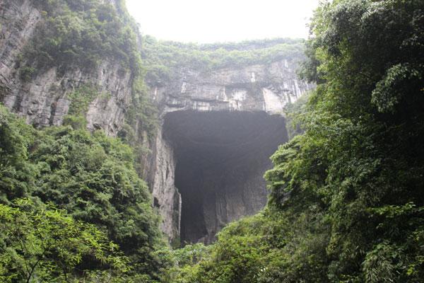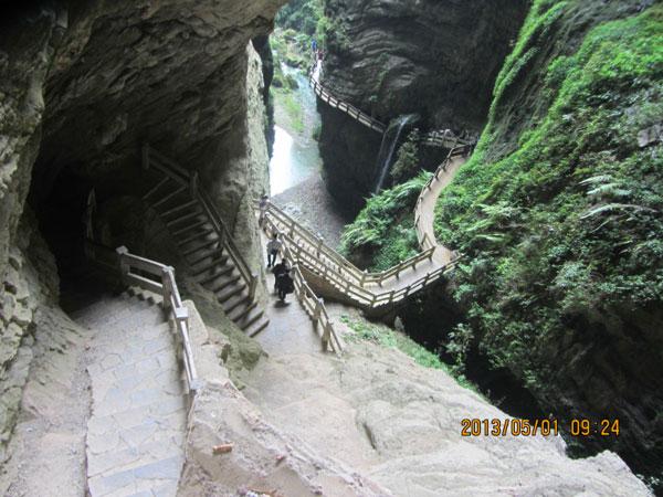 天生三橋是我們游覽的第三個景點。天生三橋是大自然的杰作。由于地質變化形成的一個巨大的坑,從谷底往上看,會看到三座天然形成、氣勢磅礴的拱橋,天生三橋因此得名。天生三橋是一個很深的峽谷,可沿著石梯步行下去,也可坐電梯下去,估計有20層樓高。三座天然形成的石橋被今人分別以龍字命名,“天龍橋”、“青龍橋”和“黑龍橋”。下到谷底,一派自然風光呈現眼前,抬頭仰望,壁立千仞、直入云霄;飛泉流水、峰青嶺綠,令人嘆為觀止。再低頭望之,谷底綠草青青、溪水潺潺,一派生機盎然。天龍橋是一個雙拱橋,在下面可以看到兩個高高的拱洞。在天龍橋下面花了兩百萬建了一個唐代古驛站“天福驛站”,是著名導演張藝謀拍《滿城盡帶黃金甲》的外景拍攝地。從天龍橋出發,沿途水流淙淙、青草碧碧、曲徑通幽,沒有半點人為的痕跡,全是一派自然風光,令人仿佛漫步在世外桃源。青龍橋和黑龍橋則是單拱的,青龍橋是“三橋”中落差最大的一座石拱橋,高350米。據說每當夕陽西下,忽明忽暗,有如真龍直上青天,故名青龍橋。走過青龍橋,回頭望之,能看到青龍橋洞細而窄,顯得秀麗挺拔,從青龍橋走來,一路飛泉流水,生動有趣。黑龍橋常年流淌著泉水,有“三迭泉”、“一線泉”等,這些泉水匯入小溪,隨著山勢流淌,最后形成了一個明靜的湖泊,湖水湛藍湛藍的,平靜得沒有一絲漣漪。說是橋,但是并不完全像橋,是抽象意義上的橋,天生三橋大峽谷風景絕美,峽谷的深度和氣魄,更是吸引人去的地方。
