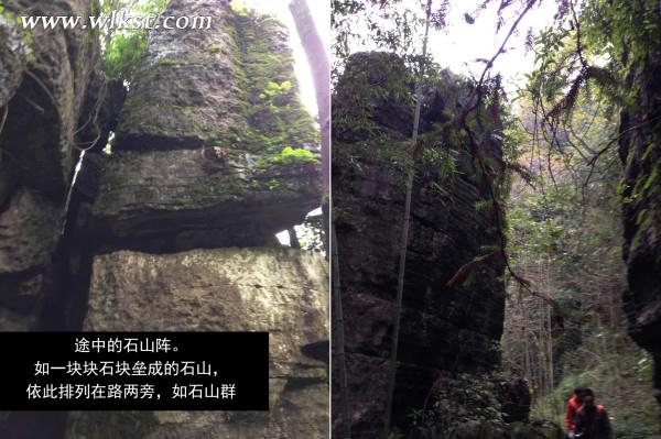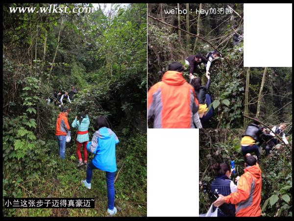 一塊大石擋在我們面前,因無人到此,石上覆蓋青苔。隱藏在青苔下面,是大石一層層突出的紋理。紋理鋒利尖銳。由于石頭過高,只得平哥及小馬哥先行爬上去后,再拉我們上去。