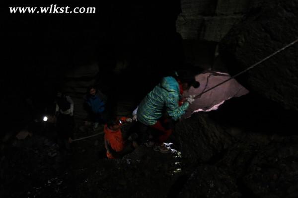 從通道爬過,又到一個寬闊空間!抬眼一看,居然是洞的出口。再像四周望去,卻發現黑暗中閃亮的熒光棒。原來我們在洞里饒了一個圈,又回到了進洞的入口!