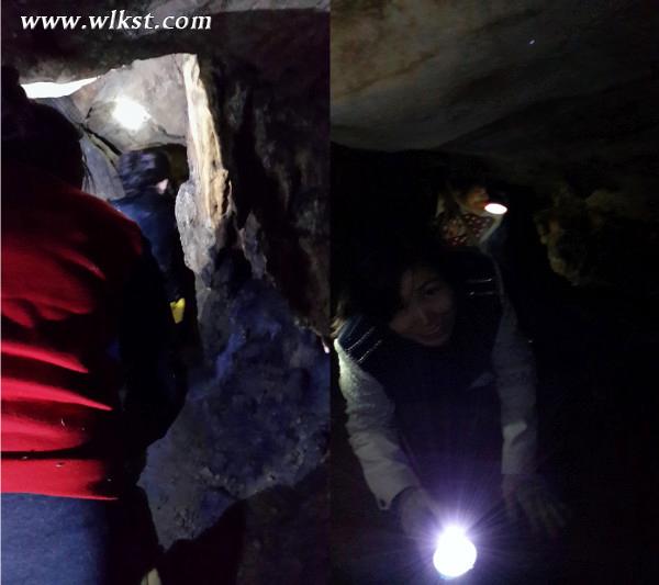 繼續朝前走是一個狹長而矮小的窄道。洞頂與左壁連為一體,傾斜著向右邊的巨石逼近,形成了一個僅容側身而過的縫隙。左壁凹凸不平,鋒利的巖石紋理和尖銳的石柱懸在頭頂。沒有戴安全帽的我們,只得壓低頭,趴在巨石上向前爬行。就在快爬出縫隙盡頭時,我以為頭頂已沒有巖石,一仰頭,便裝在石柱上。頭頂撞出了一個大包,痛得淚水瞬間涌出眼眶。之后頭上的這個大包,陪伴了我一個星期····