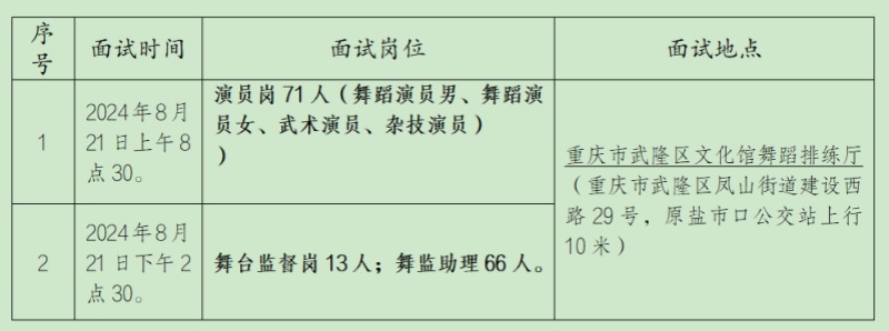 根據《重慶武隆旅游產業(集團)公司補充公開招聘<我在·武隆>演職人員公告》(以下簡稱:公告),現將面試相關事宜通知如下: