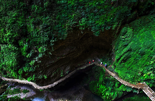 武隆的地質奇觀不止于“天生三橋”,龍水峽地縫更是堪稱一絕。峽谷長5公里,谷深200-500米,也堪稱一絕,形如地球裂開的一道深邃縫隙。谷底溪水潺潺,峰谷刀劈斧削,林深木茂,飛瀑流泉,漫游其間,仿佛置身地球心臟,感受地球心跳。