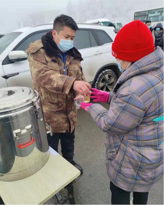 景區工作人員為游客送上暖心姜湯