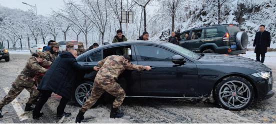 公司女子民兵連幫助誤入支路車輛打滑的游客推車