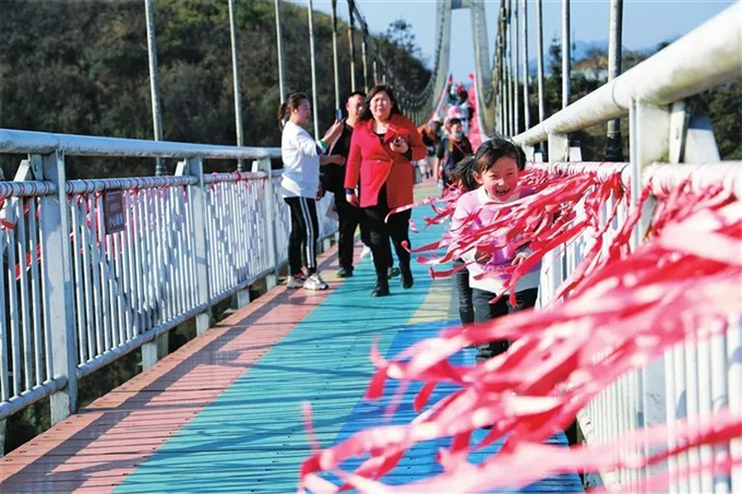 △白馬山天尺情緣景區,游客穿越同心橋。(代君君/攝)