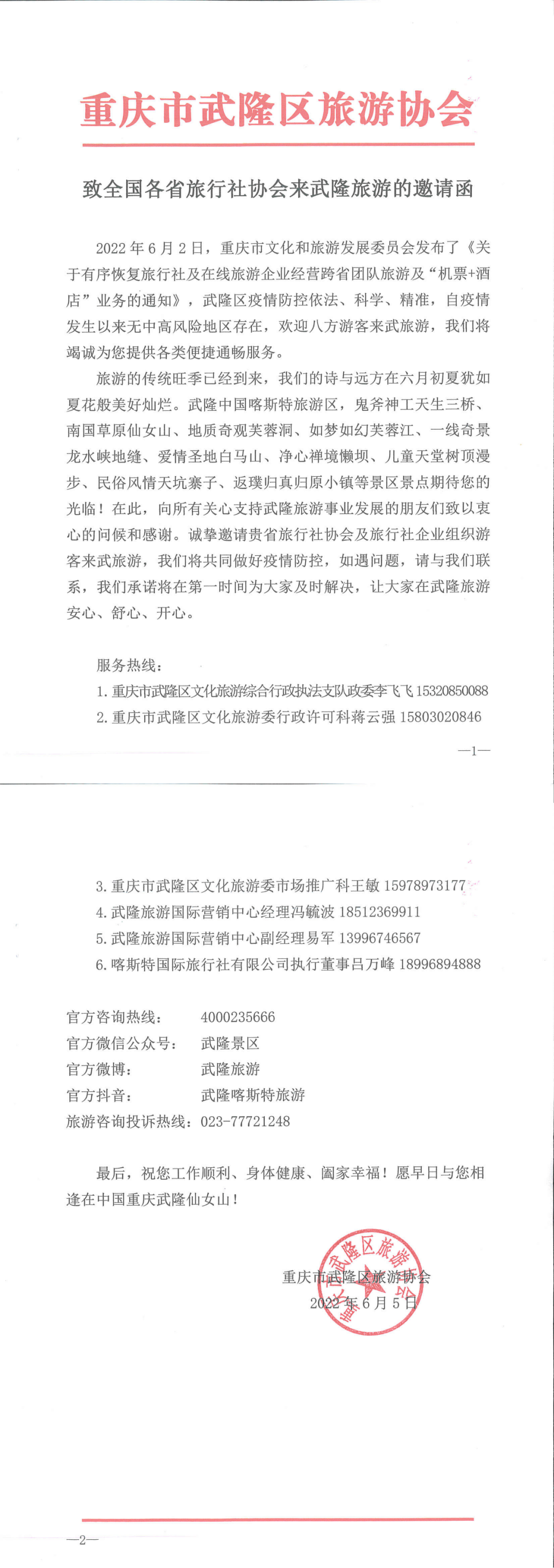 文章來源: 武隆文旅 作者:匿名 時間:2022-06-05 12:03:56摘要: 致全國各省旅行社協會來武隆旅游的邀請函,誠邀各旅行社協會及旅行社企業組織游客到武隆旅游。【免責聲明】:本平臺發布及轉載文章僅作同行交流學習,部分數據來源于網絡,未經證實,并非商業用途,也并非針對具體單位和個人,請勿對號入座,部分內容及圖片來源于網絡,版權歸原作者所有,若未能找到作者和原始出處還望諒解。如有版權疑問,或者文章內容出現侵權行為,請聯系本官網后臺,我們會第一時間及時進行刪除處理,謝謝。