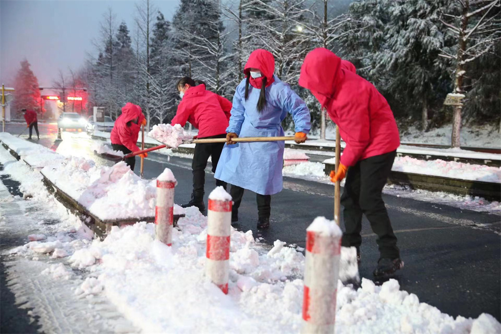 景區工作人員正奮力除雪