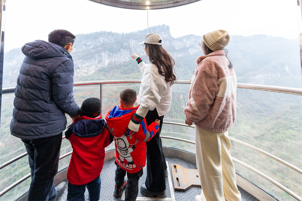 除了賞雪耍雪、看煙花,武隆天坑地縫美景對(duì)游客們也“列隊(duì)歡迎”。大年初三,國家5A級(jí)景區(qū)、世界自然遺產(chǎn)地,武隆天生三橋景區(qū)張燈結(jié)彩、年味十足。作為亞洲首部景區(qū)360度旋轉(zhuǎn)電梯,“天龍旋梯”可謂是亮點(diǎn)十足,游客紛紛前往景區(qū)打卡,站在電梯內(nèi)觀賞奇特的喀斯特風(fēng)光。