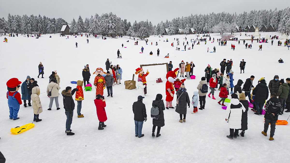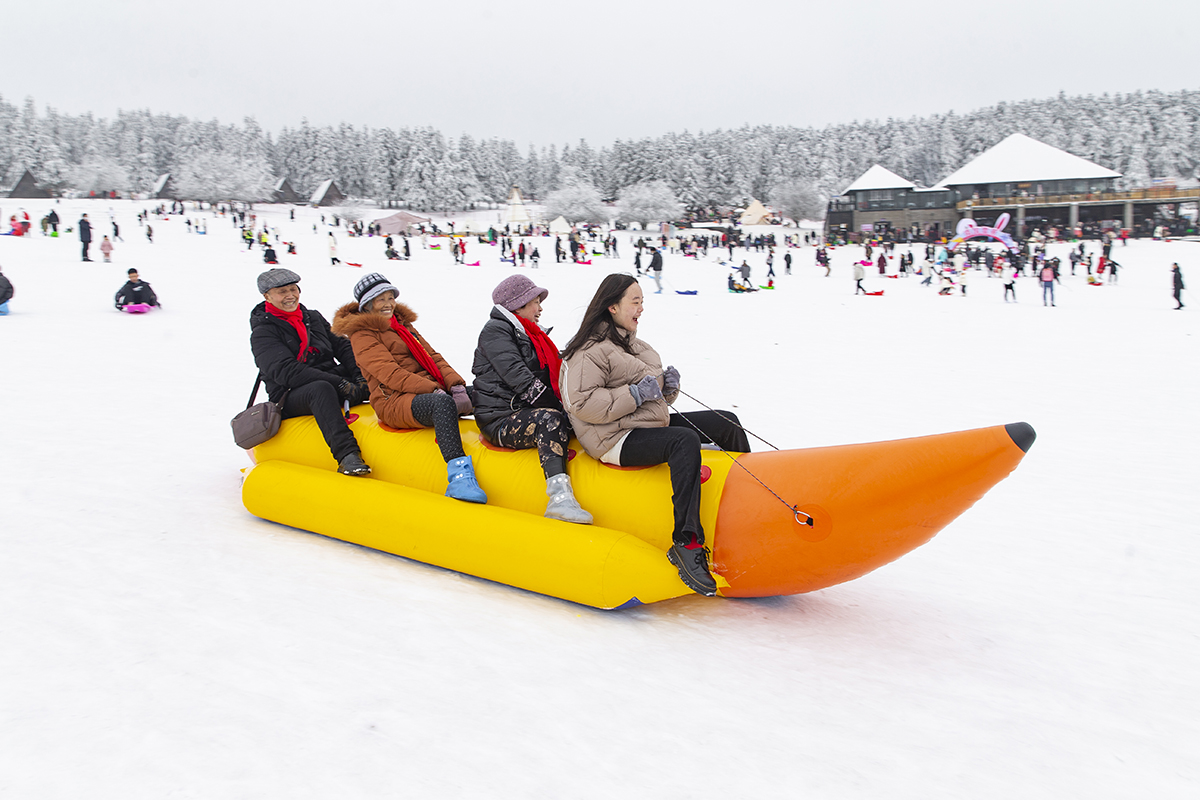 春節期間,武隆仙女山景區舉辦了豐富多彩的雪上體驗活動,雪地點球大戰、圍爐煮茶、雪上香蕉船等,眼花繚亂的玩雪新花樣,吸引眾多游客參與體驗。