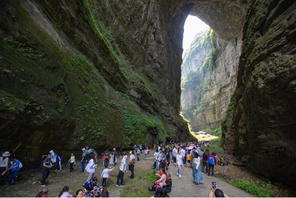 當天,游客們排隊前往了天生三橋景區,豁然洞開的天龍橋贏得游客驚嘆連連,站在高大山體橋墩下的游客們,被大自然得天獨厚的自然風光深深吸引,拍照、錄像不停歇。游客紛紛直呼“絕”,山、水、瀑、峽、橋共同構成的一幅完美自然山水畫卷,天生三橋神奇美景給大家留下了深刻的印象。