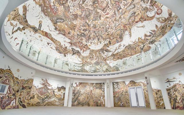大地輕盈如畫,沒有邊際。在苔蘚館區,你必須屏住呼吸,將腳步放得不能再輕,一幅名為《大地從天而降》的巨型壁畫,讓我看到了隱居在生命中的色彩和瘋狂。藝術家淺井裕介用其中一座苔蘚館的穹頂和整面圓形墻壁構圖,以19種本地泥土為顏料,創作了這幅壁畫,畫面奇幻夸張,極具視覺沖擊力。
