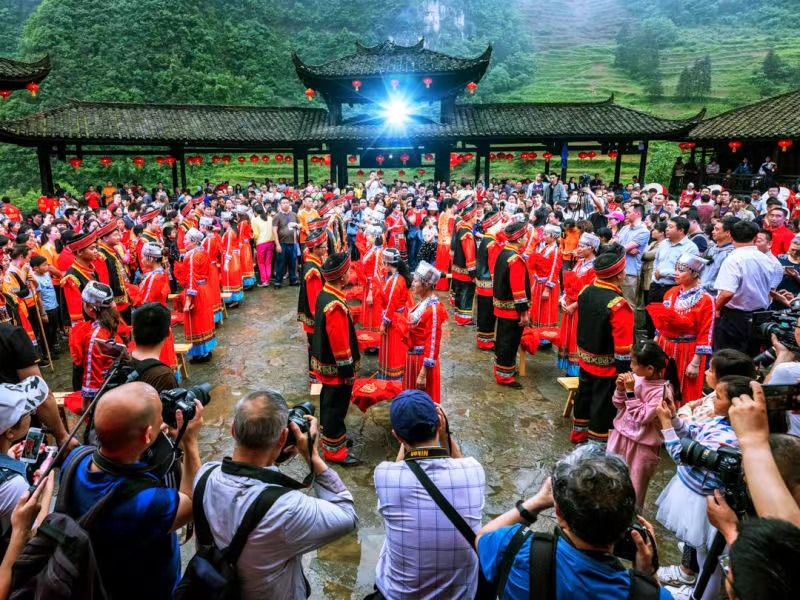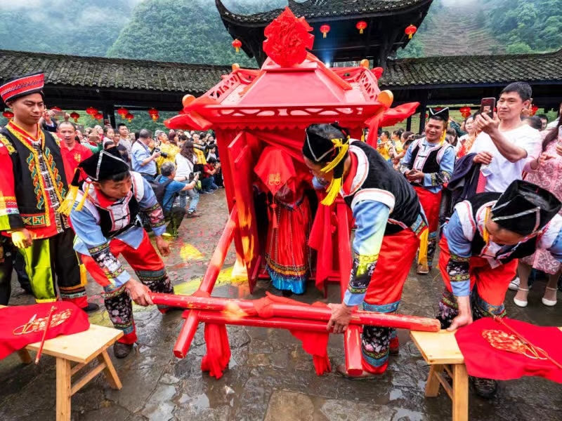 犀牛古寨原住民是土家族,至今傳承著具有濃郁民族特色的傳統(tǒng)婚嫁習(xí)俗,2023年5月19日武隆區(qū)將舉辦仙山為盟·白馬為誓520犀牛寨土家族集體婚禮活動(dòng)。在“世外桃源犀牛寨·中國(guó)醉美古村落”、在被譽(yù)為“徒步者天堂”的沿滄河畔、在千年土家吊腳樓上參加最浪漫土家族集體婚禮,一定會(huì)讓每一對(duì)新人終身難忘、幸福滿(mǎn)滿(mǎn)。