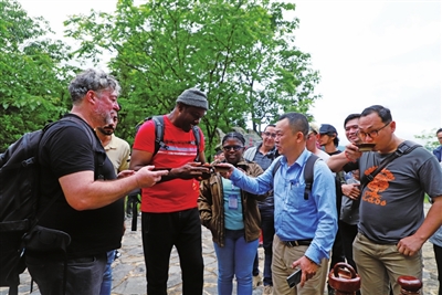 在天生三橋,外國嘉賓冒著蒙蒙細(xì)雨,一路欣賞獨(dú)特的喀斯特地貌,一邊交流巖溶研究專業(yè)問題。在后坪天坑群旁邊,前來考察的外國嘉賓通過無人機(jī)等設(shè)備,對天坑一探全貌。
