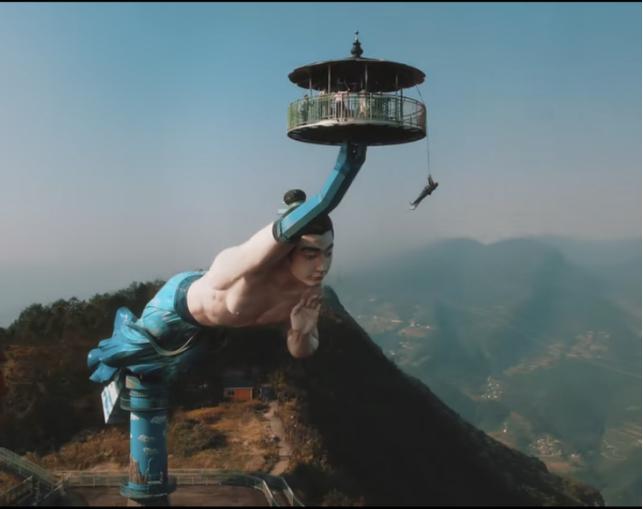 飛天之吻位于白馬山天尺情緣景區,高達55米,建立在千米高的懸崖邊上,是全球唯一的雙子互動飛行島,南邊代表的是太子,而北面代表的是仙女。一男一女兩座島嶼,從地面上慢慢升到天空當中,在高空旋轉完成高空一吻,異常刺激是重慶最熱門的網紅打卡地之一。