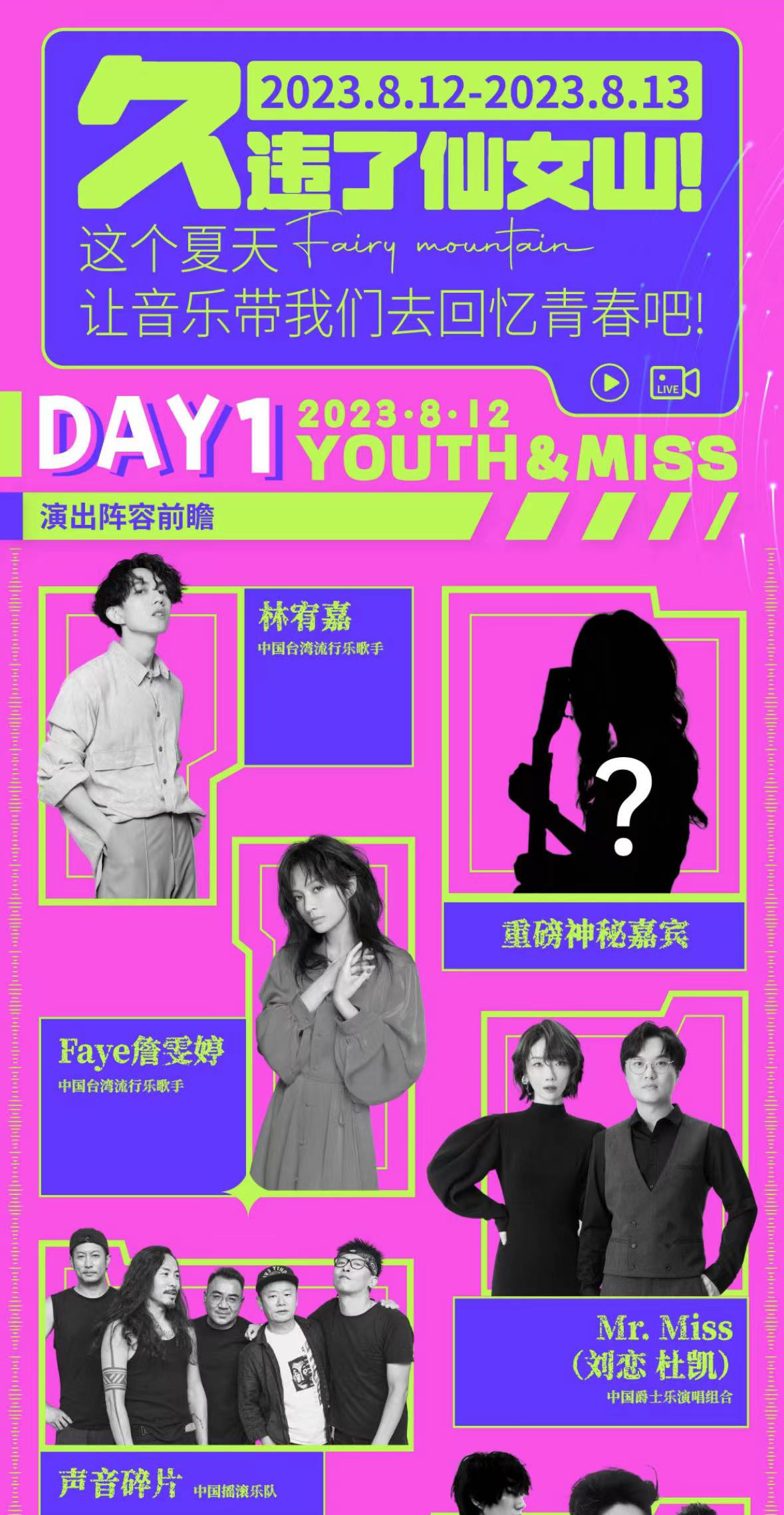 一線流量明星壓軸、超大舞臺展現(xiàn)、頂級舞美效果。特別是8月12日至13日為期兩天的明星音樂節(jié)更值得期待:林宥嘉、Faye詹雯婷、Mr.Miss(劉戀 杜凱)、聲音碎片、遺忘俱樂部、GAI周延(D.M.G)、TizzyT、ICE(楊長青)、王以太、KNOWKNOW等知名歌手現(xiàn)場助陣,領(lǐng)銜國內(nèi)頂尖樂隊帶領(lǐng)歌迷嗨翻整個夏天。此外,還有重磅神秘嘉賓即將發(fā)布,超級引人期待!