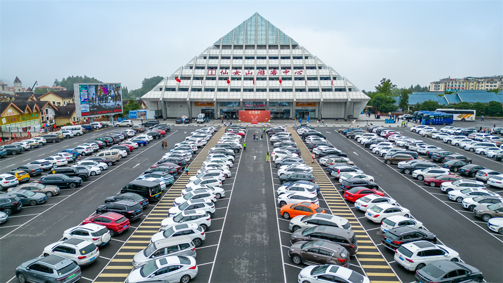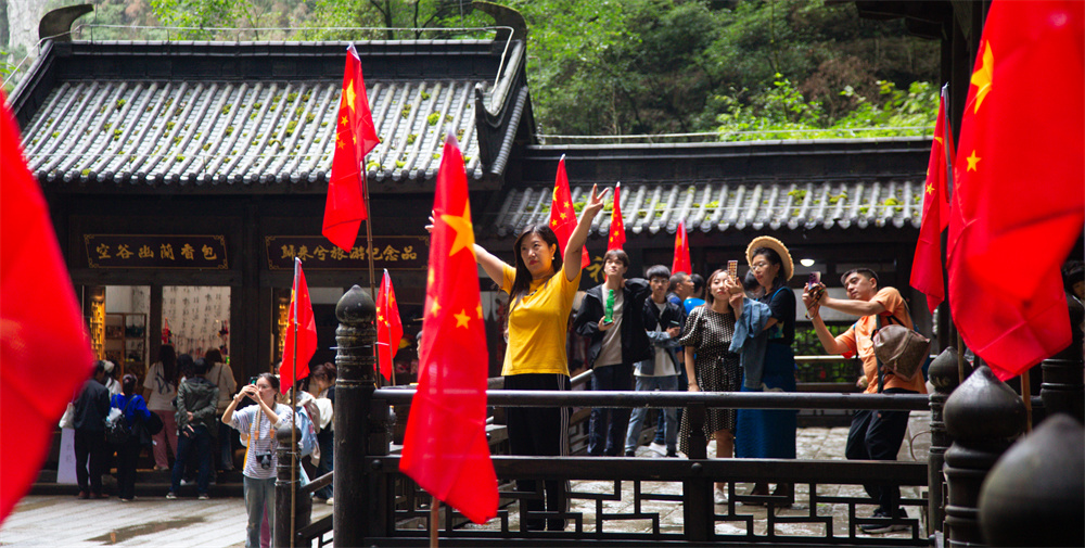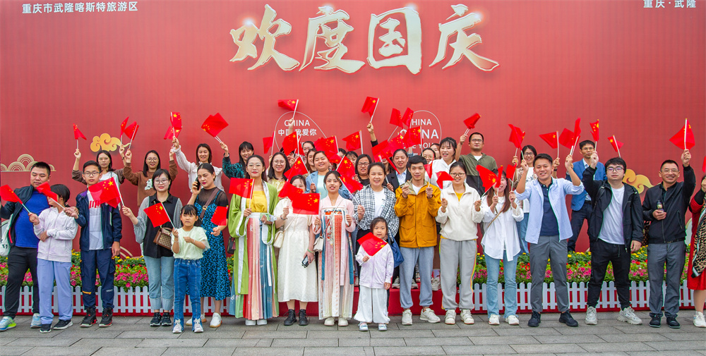 如果信仰有顏色,那一定是中國紅。國慶期間,武隆各大景區(qū)都穿上了“中國紅”新裝。在仙女山游客接待中心,景區(qū)設(shè)置了巨型“歡度國慶”紀念展板,吸引不少游客拍照打卡。每個人都揮舞手中的小紅旗,給現(xiàn)場染上熱烈的紅色。