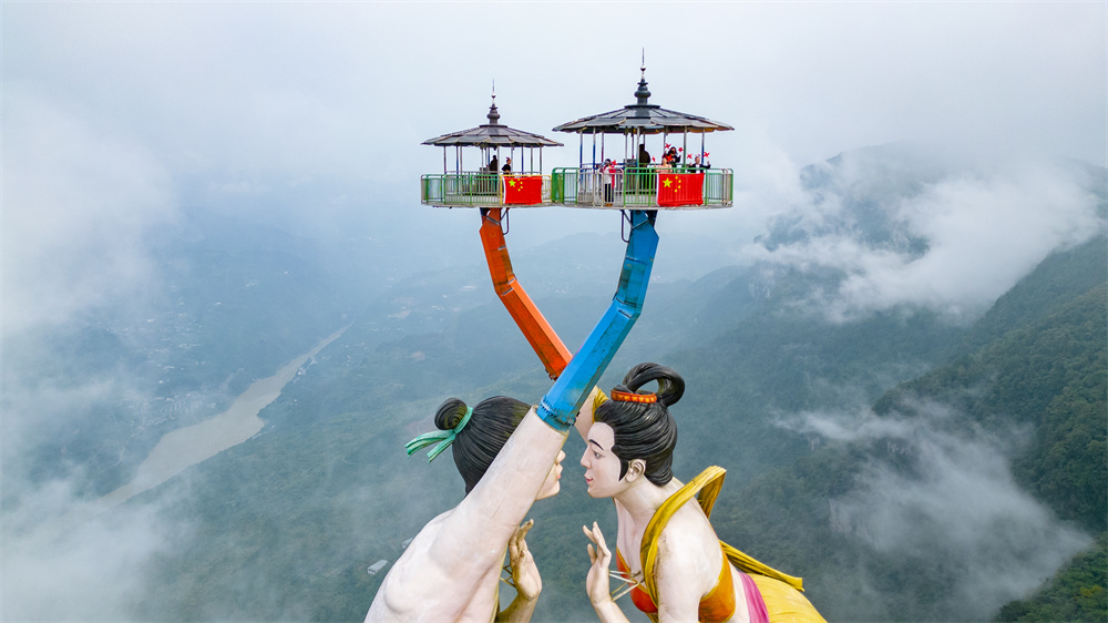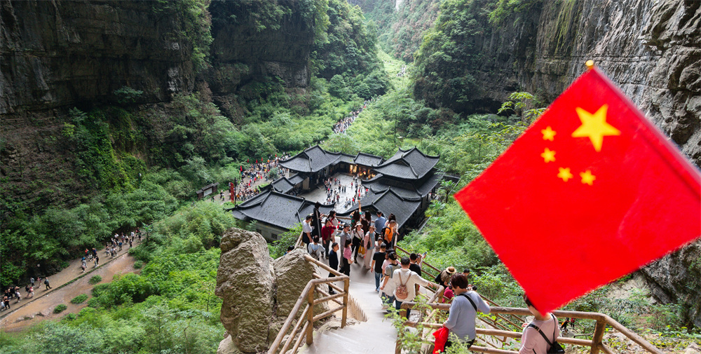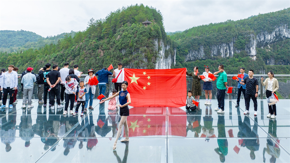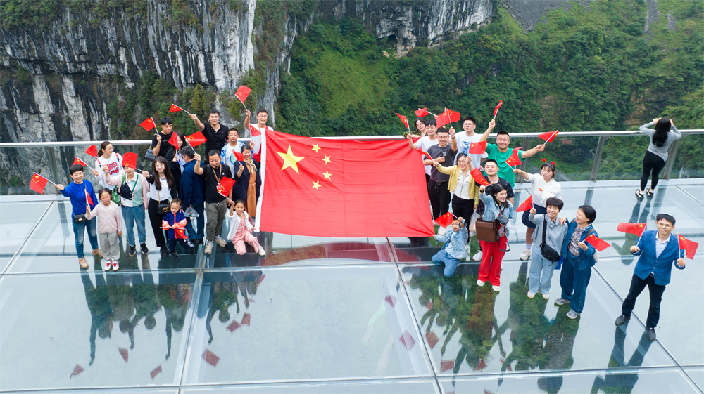 下午2點,在300米垂直懸崖絕壁之上,一面火紅的國旗尤其絢麗吸睛,多名游客登上武隆天生三橋懸崖玻璃眺臺,在300米高空和國旗合影,以此來表達對祖國母親的祝福。