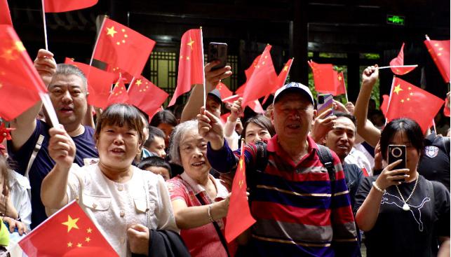 在現(xiàn)場不管男女老少,都紛紛加入其中,此起彼伏躍動的中國紅,形成一片亮麗的“紅色海洋”。游客無不為之動容,聲情并茂地演繹了這首獻給祖國母親的生日贊歌。“祝祖國生日快樂!”最后,在游客的高聲吶喊中,將歡樂喜慶氣氛推向高潮。