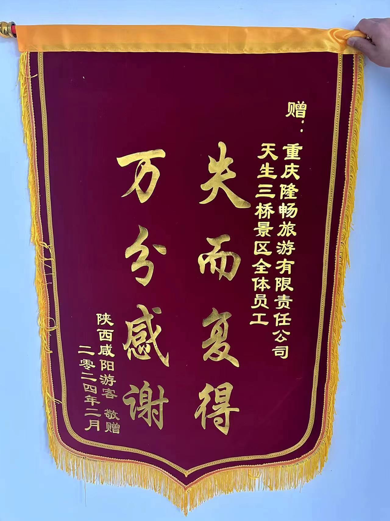 今年以來,武隆景區(qū)多次發(fā)生類似員工拾金不昧,被游客稱贊的情況。近日,武隆天生三橋景區(qū)收到陜西籍游客王女士寄來的包裹,包裹里是一面繡有“失而復(fù)得、萬分感謝”的錦旗,以此對天生三橋景區(qū)全體員工拾金不昧的行為表示誠摯地感謝。