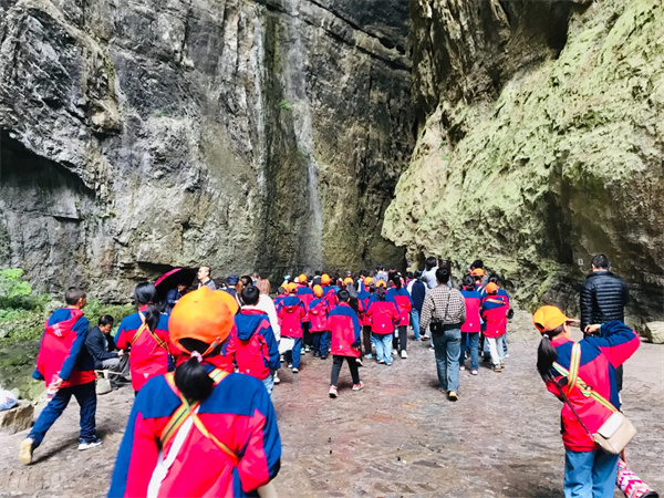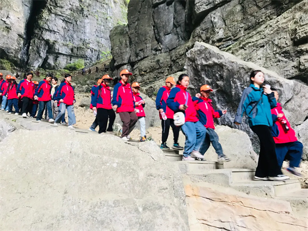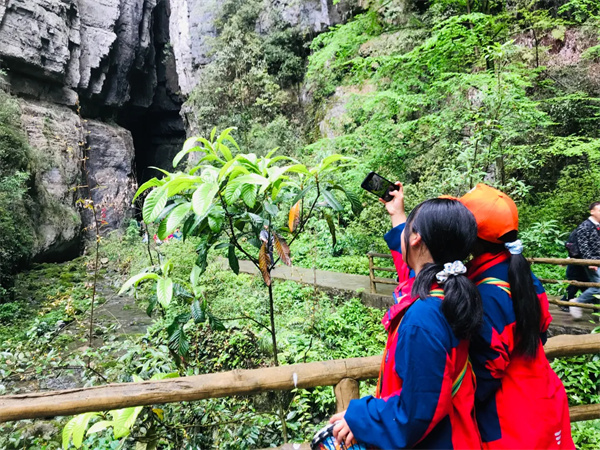 學生們沿著蜿蜒的石板小路,穿梭在雄奇險峻的天生石橋間,切身感受自然與人類之間的和諧共存,盡情領略喀斯特地貌的獨特魅力。一步一景、步步奇觀。