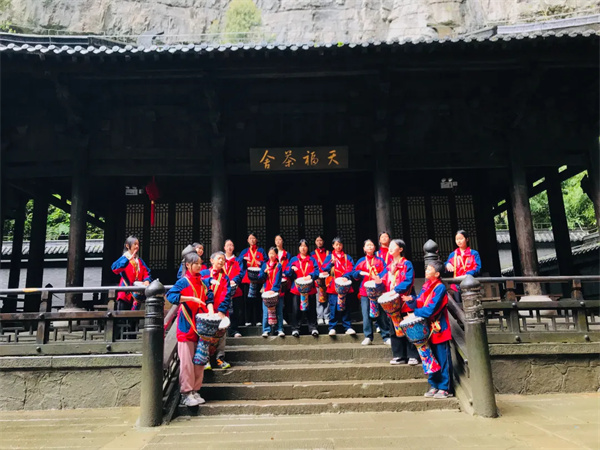 天福官驛是位于天坑腳下的著名景點,也是進入天生三橋的必經之路。這里是著名影片《滿城盡帶黃金甲》和《變形金剛4》的取景地,這處彰顯古典美的建筑與天生三橋的景色交相輝映、相得益彰。在天福官驛,學生們充滿熱情演繹的手鼓《精忠報國》《可能》也紛紛吸引了不少來武游客的駐足觀看,為他們的演繹鼓掌吶喊。