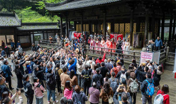 與此同時,今年五一期間,以國家非物質文化遺產“川江號子”為主題的大型山水實景演出“印象武隆”也是場場爆滿,備受游客朋友青睞。晚上8點,在喀斯特地貌形成的天然劇場內,游客坐在落差200米的峽谷里,聆聽非物質文化遺產“川江號子”,感受跨越千年的民俗文化。