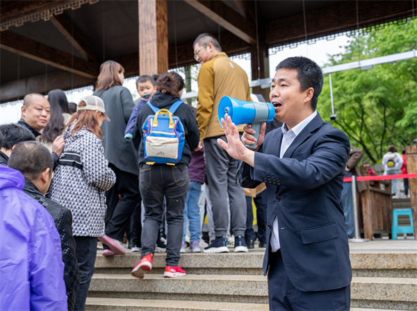 在天生三橋景區,游客朋友們有序排隊檢票入園,開啟屬于自己的震撼之旅。雄偉壯觀的天生石橋、蔥郁繁茂的草木綠植,引得游客紛紛駐足觀賞,感嘆大自然的鬼斧神工。在古色古香的天福官驛,七仙女“拋繡球擇郎君”、巡捕互動、投壺等游戲接連上場,帶領游客穿越時空,感受古時的“浪漫”。