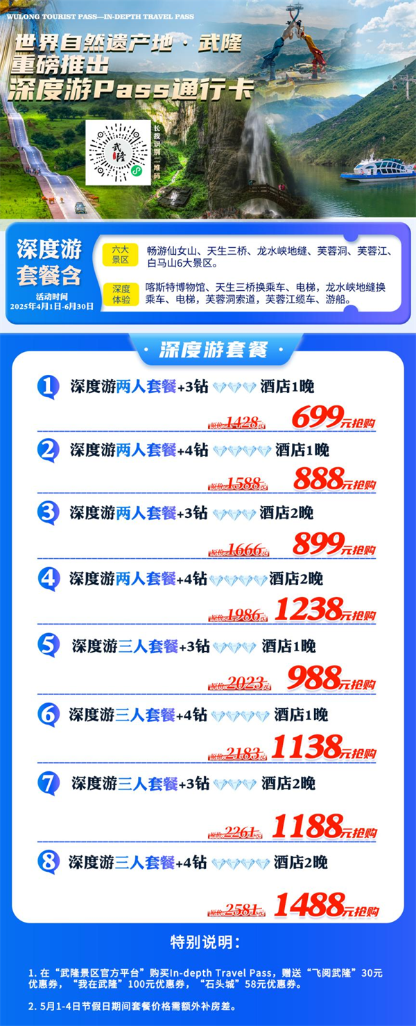 如果你是一家人集體出游,強烈推薦武隆「深度游Pass卡」 ,一卡解鎖6大景區!讓一家人盡情領略武隆的絕美風光,從雄偉的天生三橋到幽深的龍水峽地縫,從神秘的芙蓉洞到秀麗的芙蓉江,從愜意的仙女山到浪漫的白馬山天尺情緣景區,每一處都能留下難忘的家庭回憶 ,更有額外《我在武隆》、《飛閱武隆》演出優惠券贈送,讓你玩得自在又盡興。