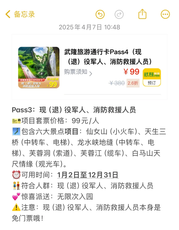 山東籍游客、人民教師、人民警察、醫護人員、現(退)軍人、消防人員注意啦!武隆為你們準備了專屬套票。山東籍游客僅需99.9元,就能暢玩仙女山、天生三橋等六大景區;教師、警察、醫護人員,花199元就能拿下包含門票、中轉車、索道等在內的超值套票;現(退)役軍人與消防救援人員,99元即可享受項目套票,在免門票基礎上暢玩無憂 。這是武隆對你們的敬意與感謝。