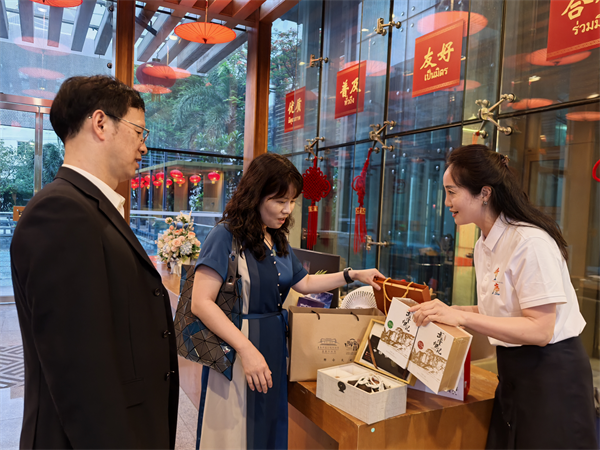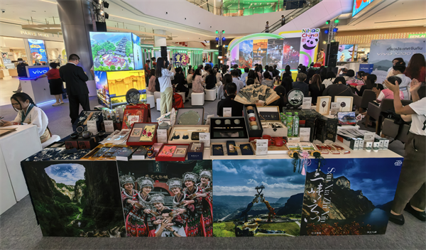 “旅游展臺”現(xiàn)場鋪設(shè)泰文、英文雙語宣傳冊及精裝畫冊,詳細(xì)介紹“重慶+武隆”精華線路產(chǎn)品,將“8D魔幻之城”重慶與“世界自然遺產(chǎn)地”武隆完美串聯(lián),勾勒出其獨特魅力。“非遺展臺”文創(chuàng)區(qū)則以冰箱貼、折扇等“武隆元素”衍生品傳遞山城詩意,浩口蠟染以靛藍(lán)扎染演繹“山水入布”,仙女紅氤氳著云霧深處的茶香,武隆非遺柴燒制藝讓非遺之美成為可以攜帶的旅行記憶。