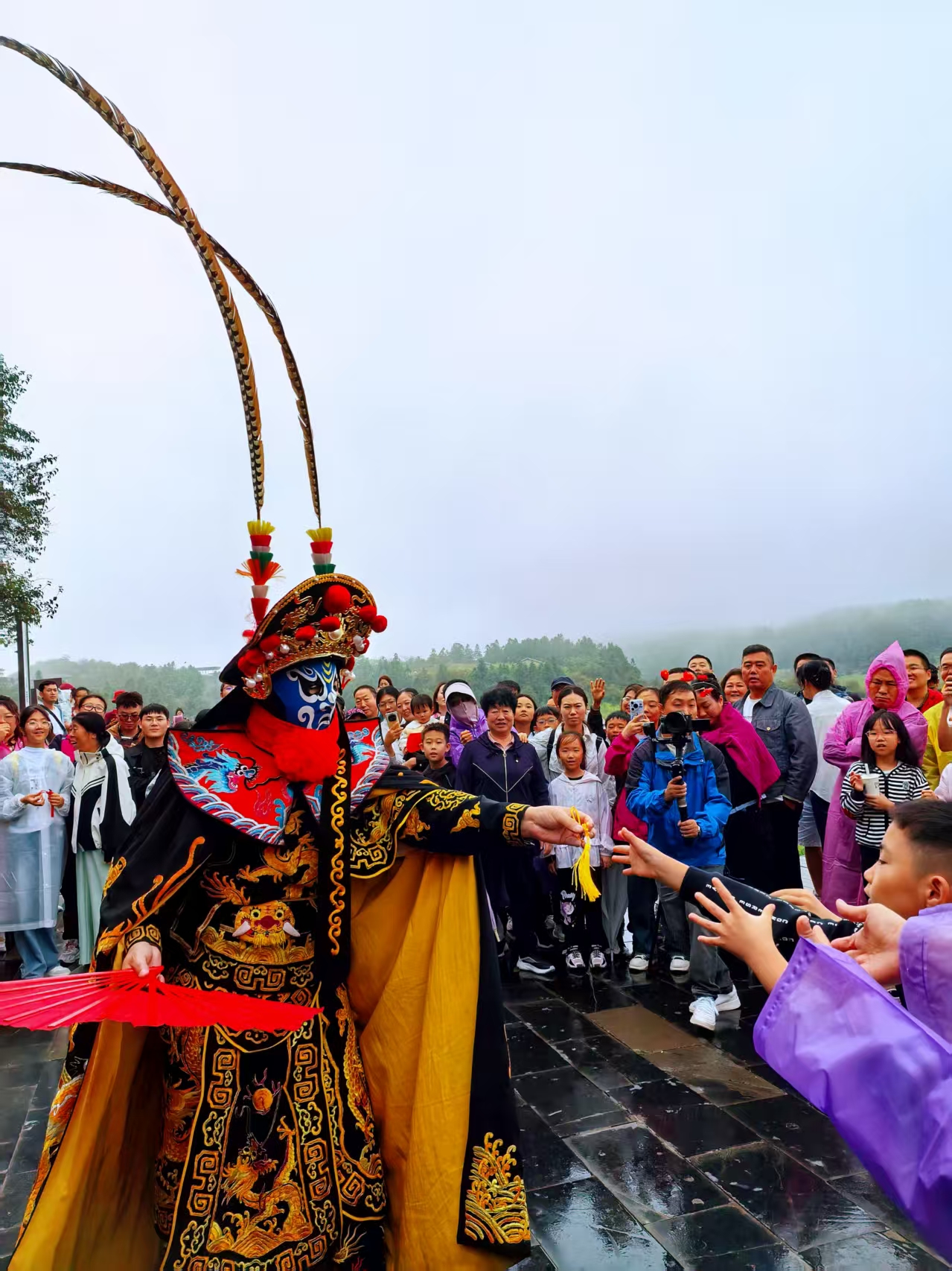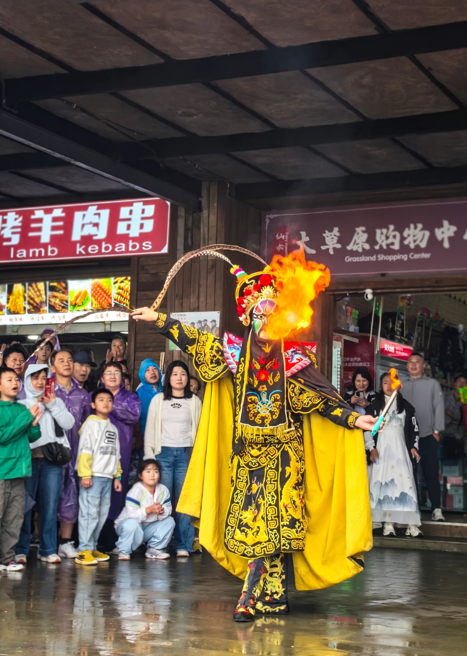 非遺展演區(qū)入口掛著 “非遺賀國(guó)慶” 橫幅,川渝變臉?biāo)嚾说? “九變” 絕技融入紅色臉譜,變臉間隙比出 “國(guó)慶快樂” 手勢(shì);噴火表演時(shí),火焰映著周邊小國(guó)旗,引得孩童拽著家長(zhǎng)蹦跳,藝人下臺(tái)還為孩童貼國(guó)旗貼紙。