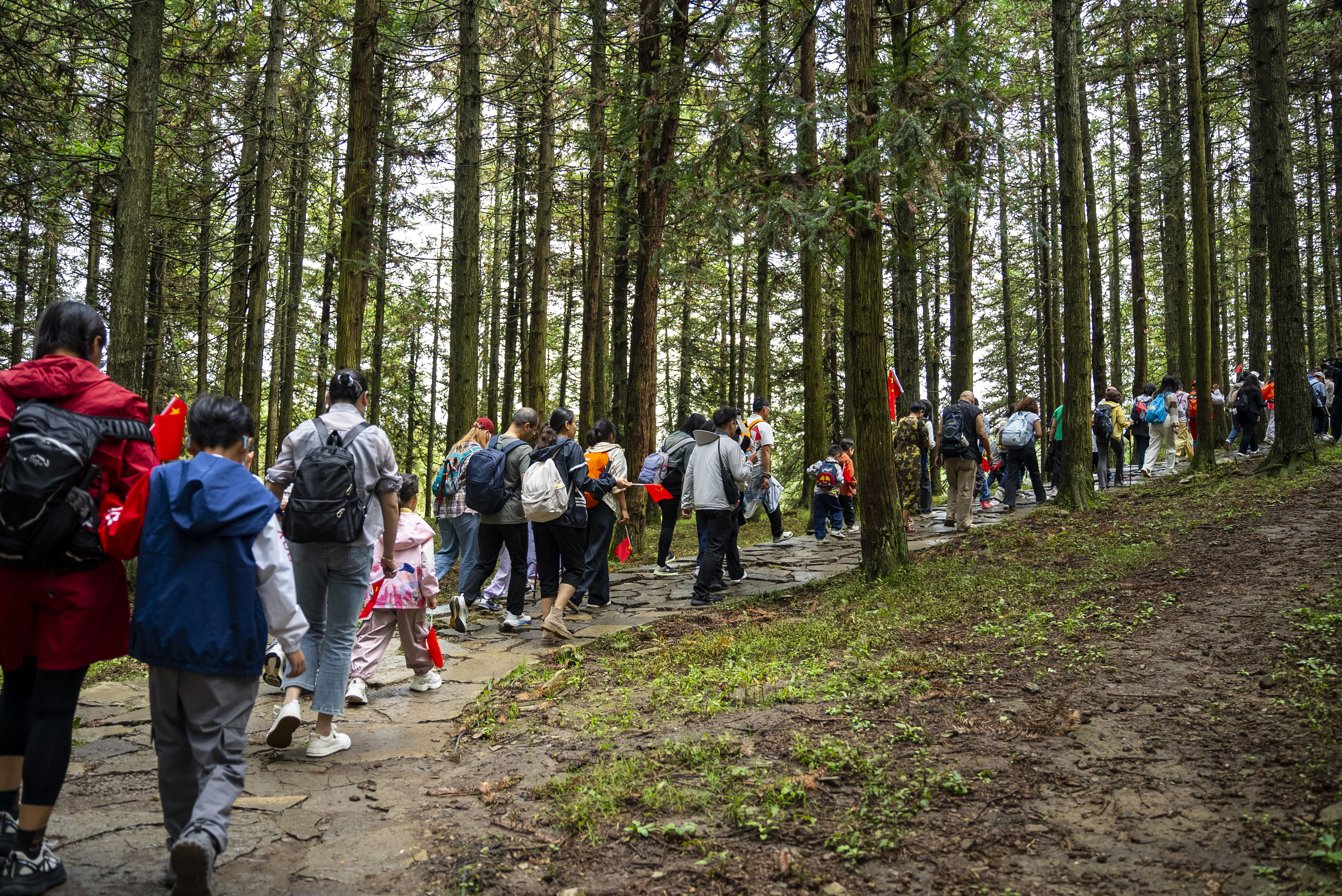 晨光點(diǎn)染,秋日的仙南牧道蘇醒,身著亮色沖鋒衣的徒步隊(duì)伍沿山道綿延,不少人背包插著小國(guó)旗,登山杖聲與 “國(guó)慶快樂” 的問候交織。