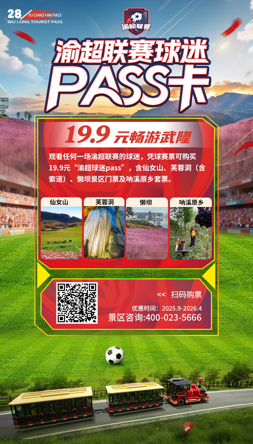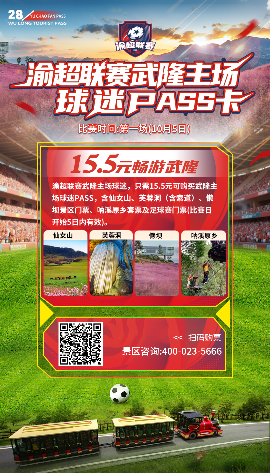 2025年9月至2026年4月,憑任意一場渝超球票購票憑證,就可在“武隆景區官方平臺”以19.9元搶購仙女山、芙蓉洞、懶壩三大景區套票。