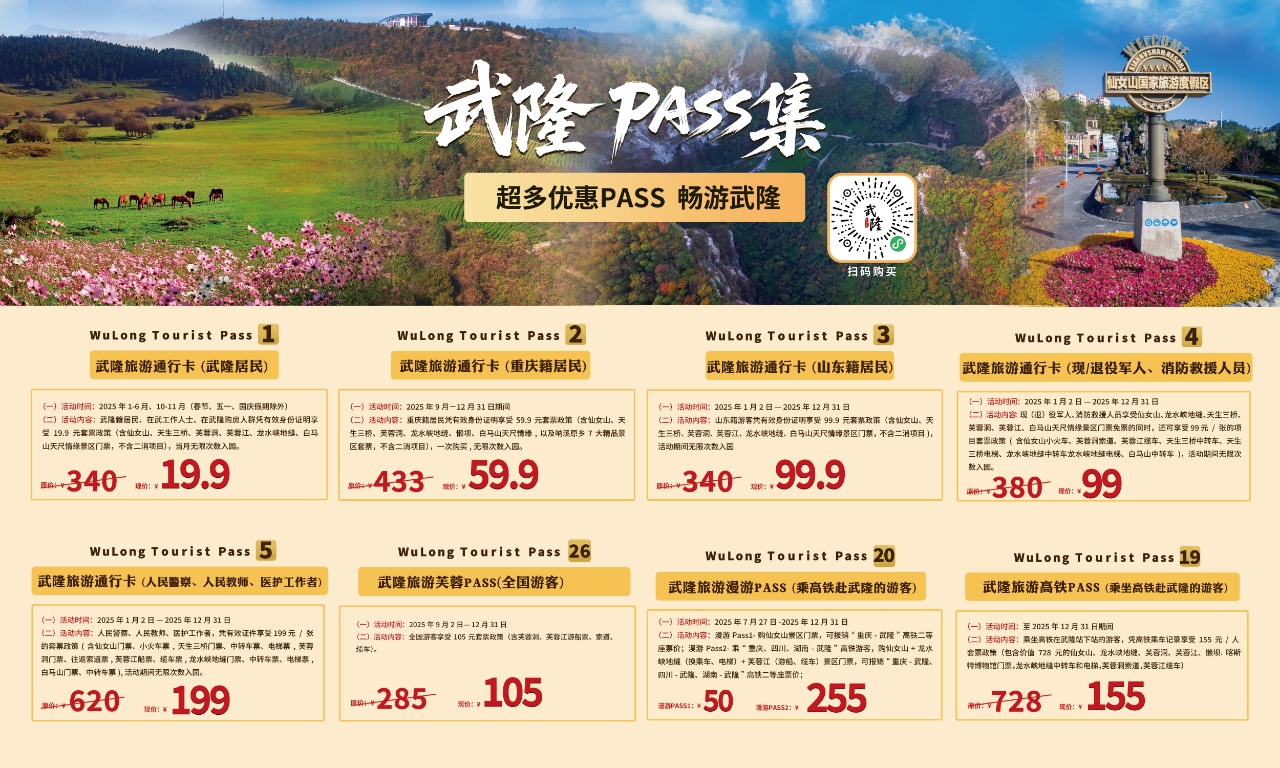 多部門聯動構建起全方位服務體系,推出多種優惠Pass產品。重慶籍游客可享59.9元無限次暢游七大景區,高鐵旅客、現退役軍人等群體享有專屬福利,“芙蓉Pass”等普惠政策覆蓋廣泛。